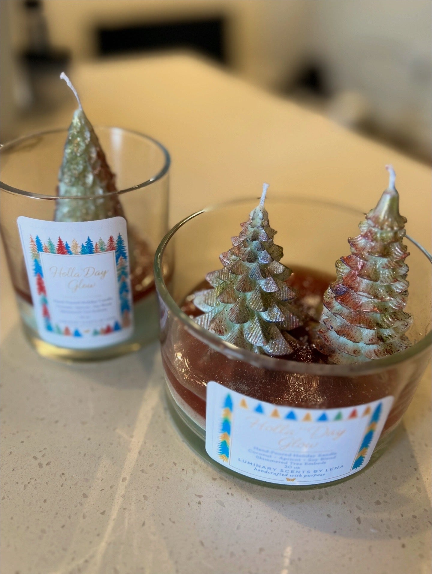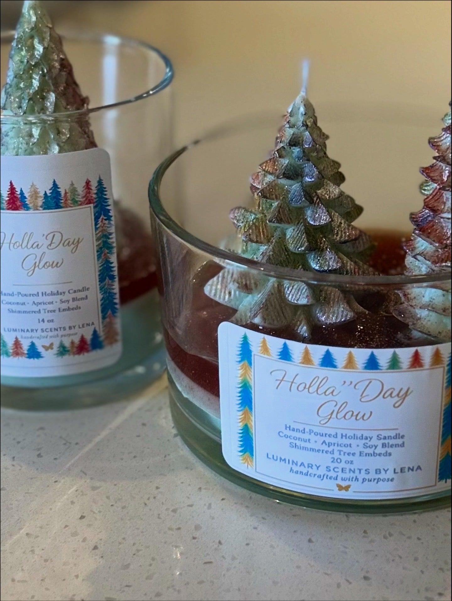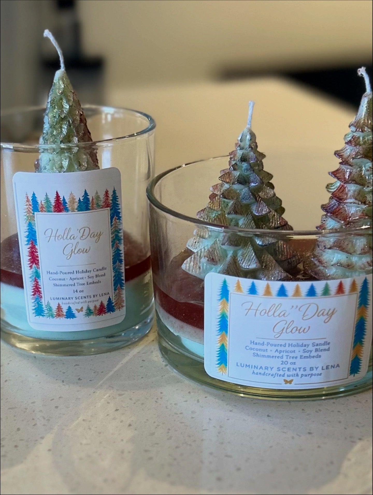 Bring the magic of the holidays straight into your home with Holla’Day Glow, a luxury Christmas tree–inspired candle designed to sparkle, shimmer, and set the perfect seasonal mood. Each candle is hand-poured with a premium coconut–apricot–soy blend and features shimmering tree embeds for a beautiful festive finish.