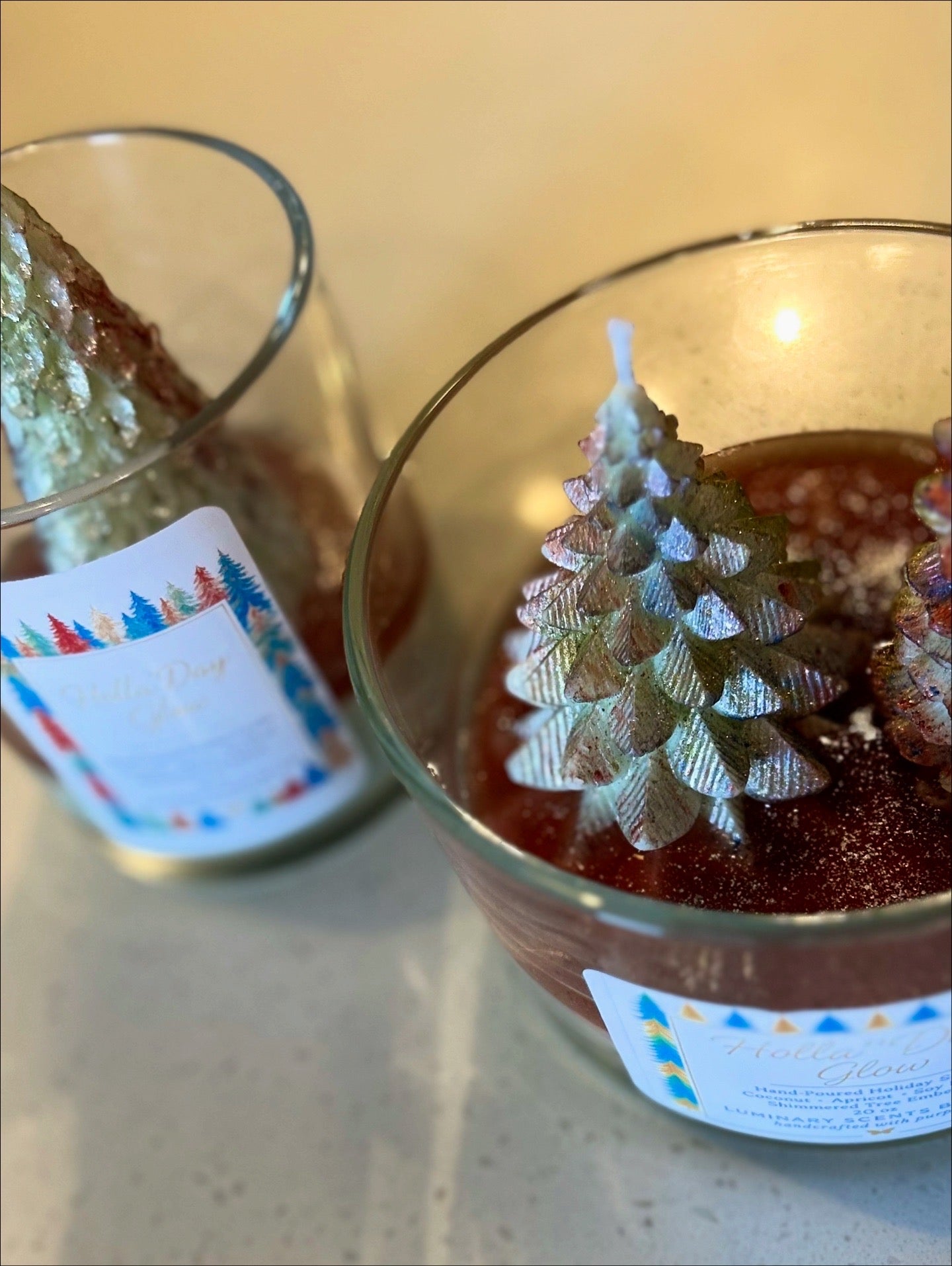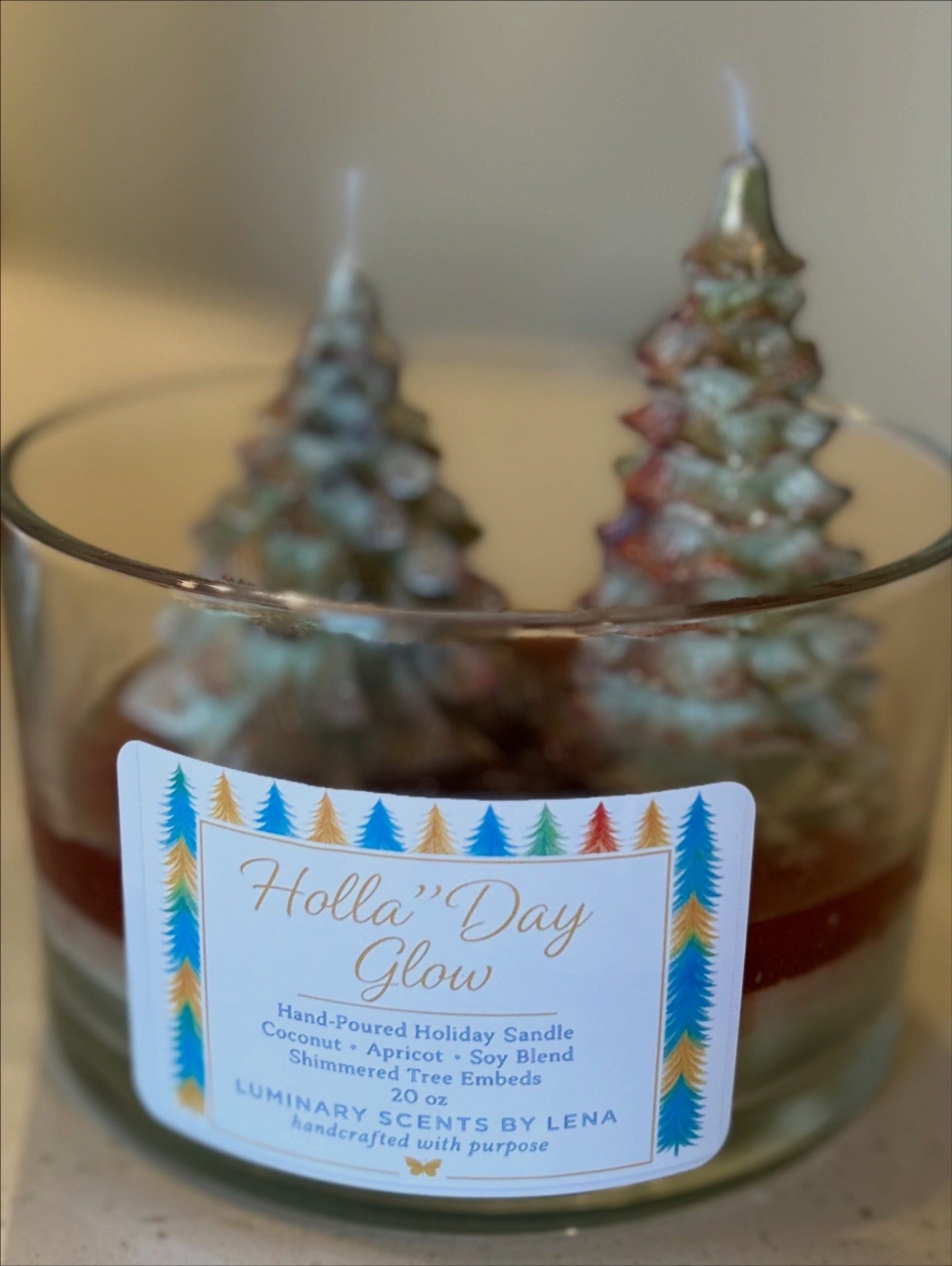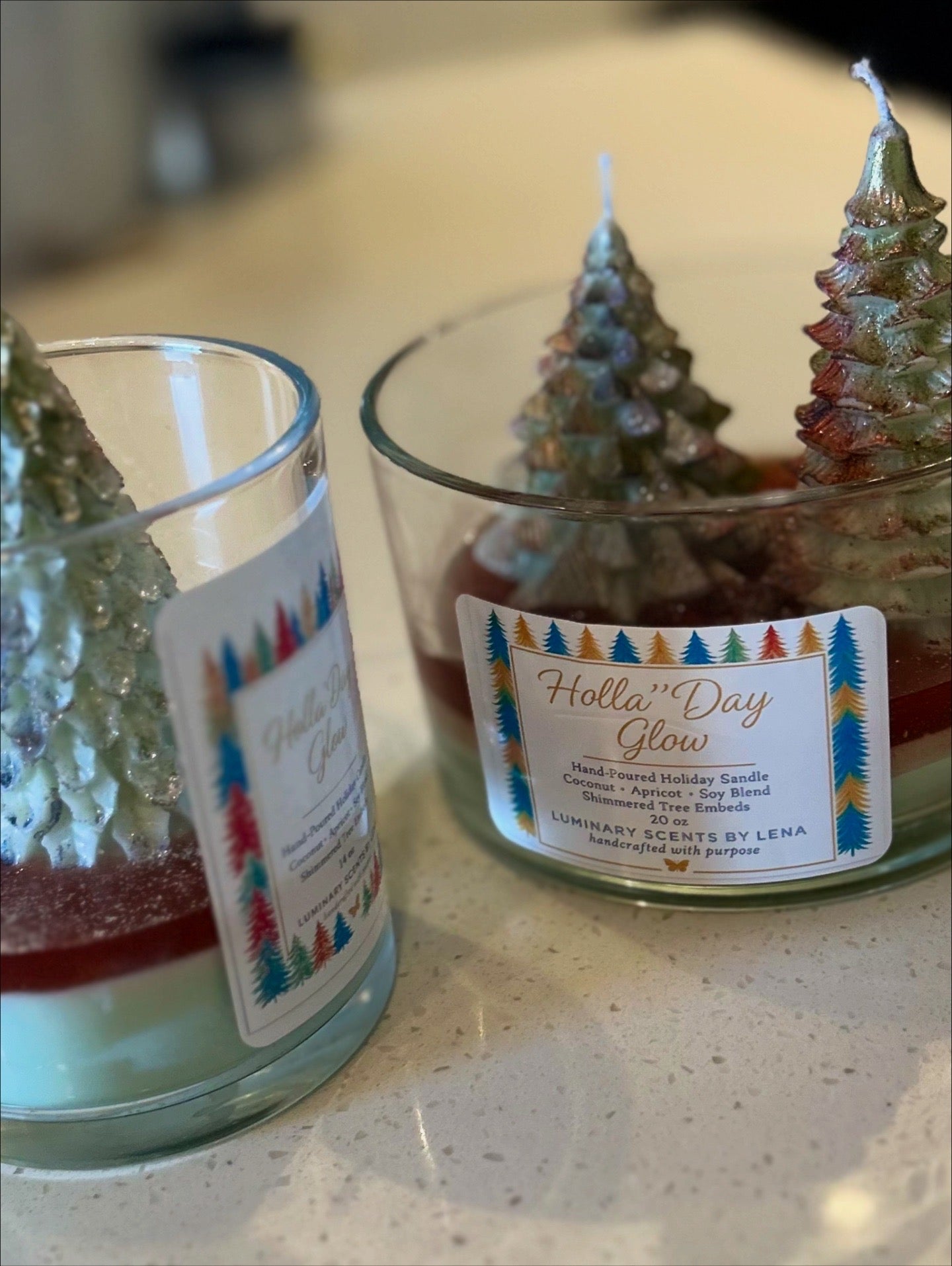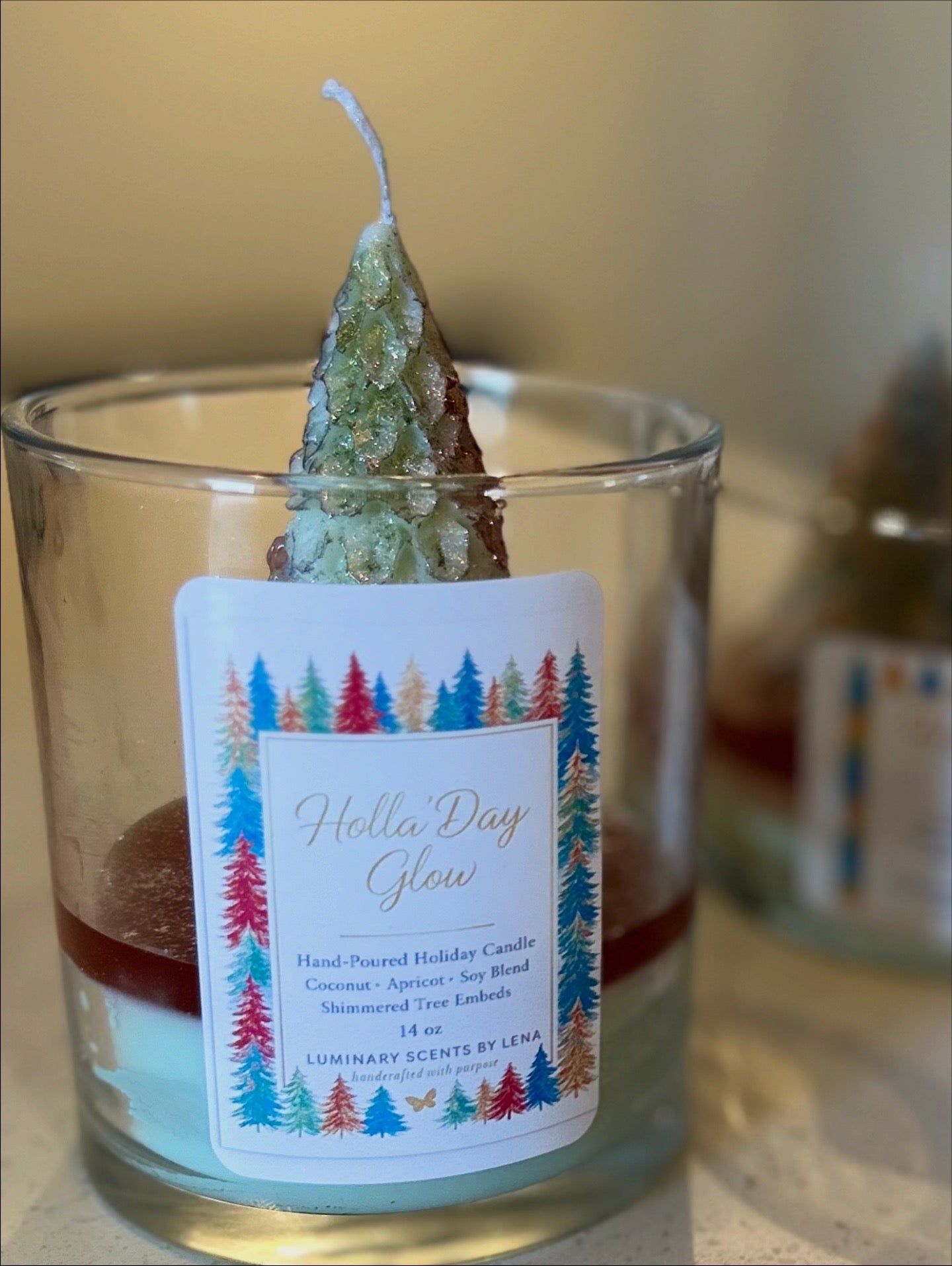 Bring the magic of the holidays straight into your home with Holla’Day Glow, a luxury Christmas tree–inspired candle designed to sparkle, shimmer, and set the perfect seasonal mood. Each candle is hand-poured with a premium coconut–apricot–soy blend and features shimmering tree embeds for a beautiful festive finish.